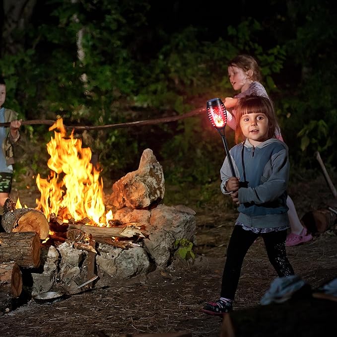 - 🔥Dancing Flickering Flames: Solar torch lights flicker gorgeous dancing flames, a safe alternative to the real “Flames”. Combining multiple flame lamps together can create a more perfect campfire atmosphere
