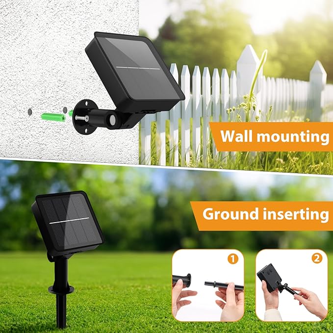 - 【2 Installation Methods】 Equipped with ground stakes, screws, and explosive nails. Follow the instructions and the installation is very quick. Solar panels can not only be installed on the wall to receive sunlight, but can also be inserted into the ground to absorb sunlight. 2 installation methods can meet different decoration needs