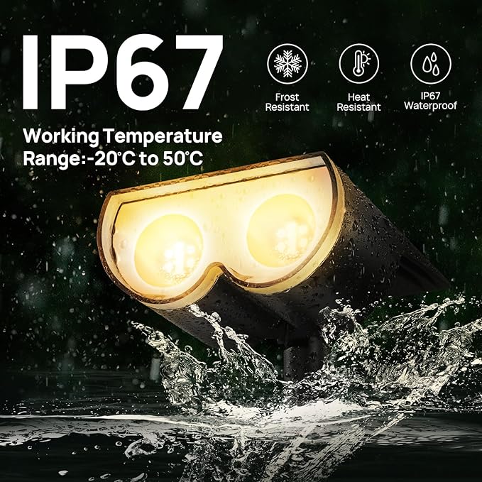 - [IP67 Waterproof & Durable] : IP67 waterproof, Heat Resistant and Frost Resistant, no matter it rains, snows, frost, high heat or other extreme weather, you can use the solar landscape lights at ease. Made of high-quality and premium ABS material, closely fit to form a seamless light head, leaving no chance for the rust and water to erode the light, solid and durable enough for longer lifespan.