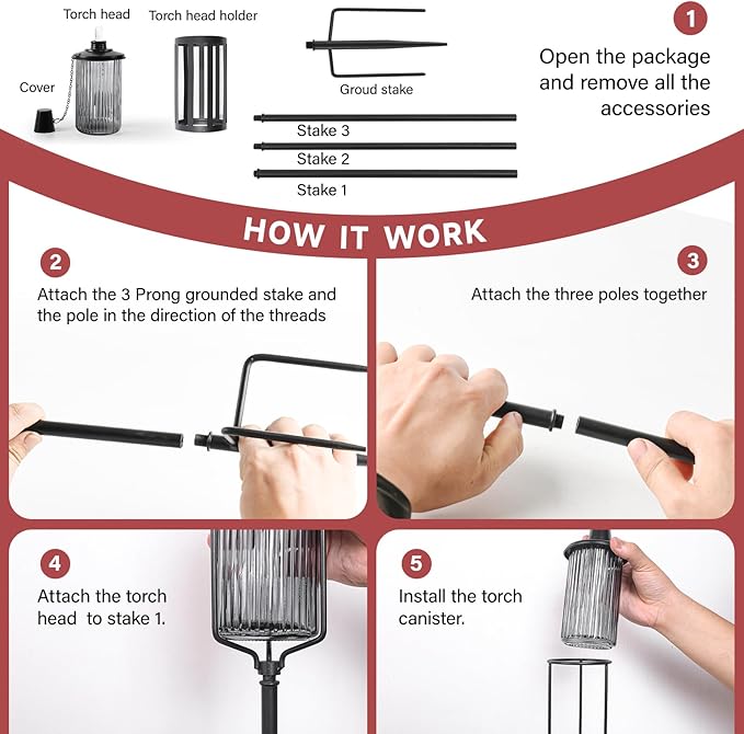 - 【Easy to Assemble】No tools needed, just screw all the parts together as the instruction. Upgraded 3-prong stakes make the torches more stable.