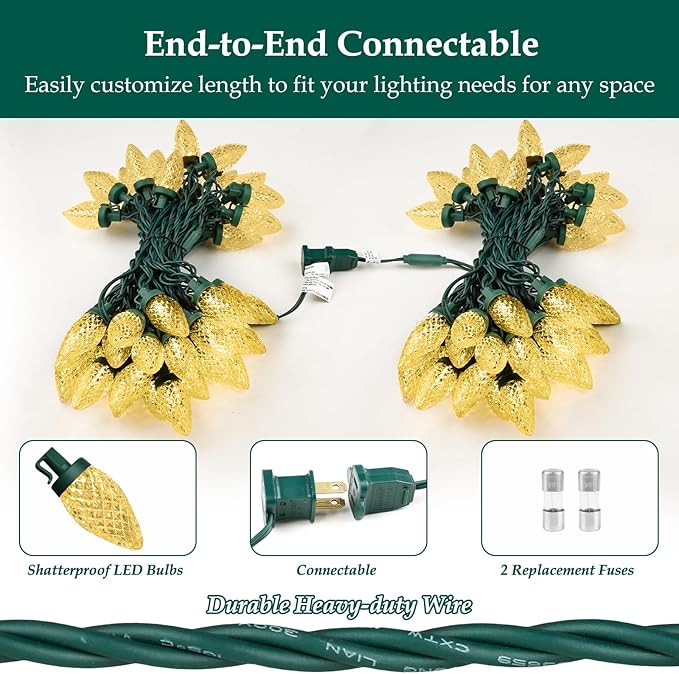 - đăShatterproof C9 Strawberry LED Bulbsă Each strand of string lights is 34 feet long and equipped with 50 bright C9 strawberry-shaped LED bulbs. They are easy to use - just plug and unplug for ON and OFF - and long enough to wrap around a Christmas tree or anywhere else you'd like to add some light, such as your porch, garden, lawn, yard, or roof.