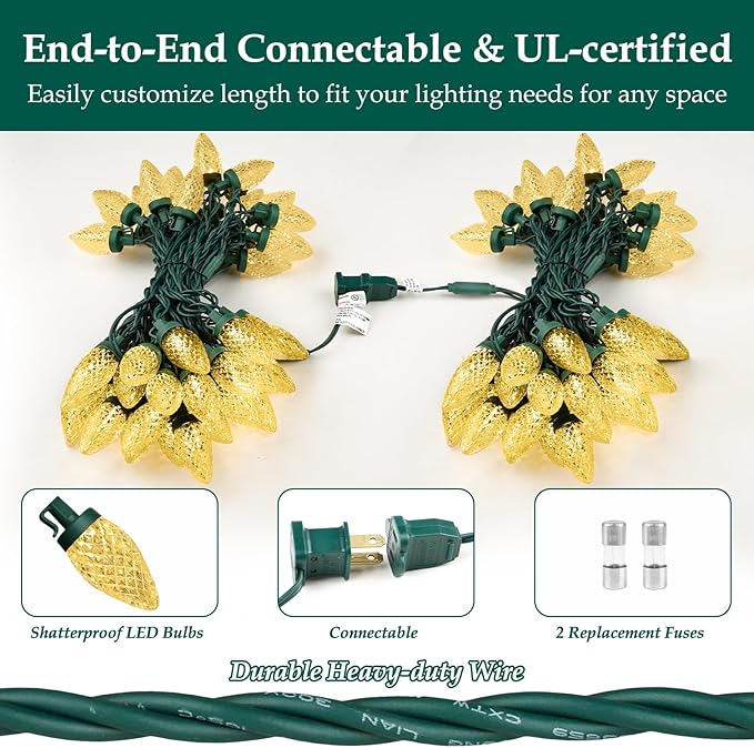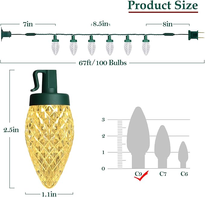 - đăShatterproof C9 Strawberry LED Bulbsă Each strand of string lights is 67 feet long and equipped with 100 bright C9 strawberry-shaped LED bulbs. They are easy to use - just plug and unplug for ON and OFF - and long enough to wrap around a Christmas tree or anywhere else you'd like to add some light, such as your porch, garden, lawn, yard, or roof.