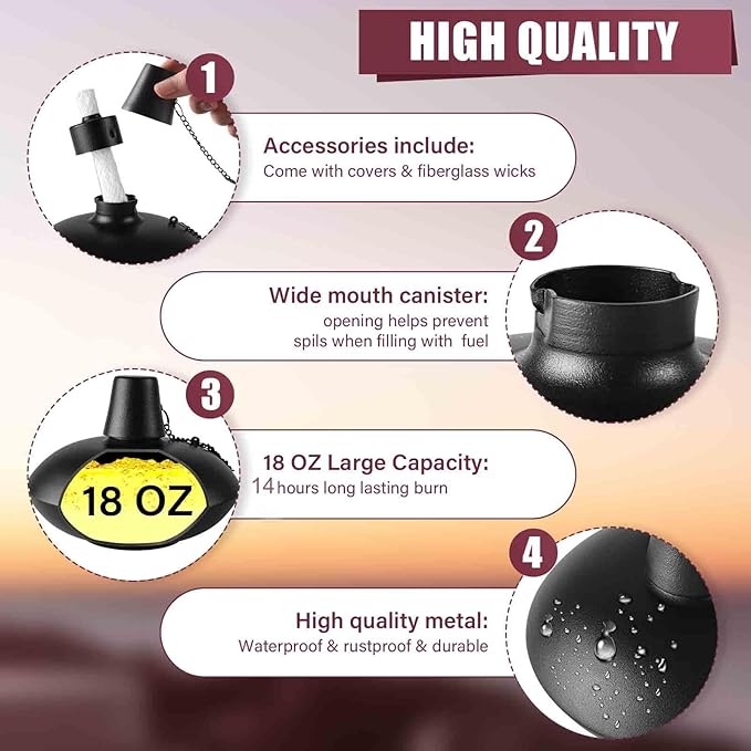 - ✿High Quality Metal Table Top Torches: Our Metal Table Top Torches made of premium metal. durable and lightweight. Each tabletop torches hold approximately 18 oz of fuel, allowing the burning time more than 6 hours .