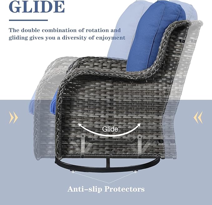 - 【Marvelous Design Wicker Swivel Rocker】 The base of the outdoor swivel rocker chair is a dual-function round base that can rotate 360 degrees and also glide back and forth. The rocking design helps you sit more easily and comfortably, with a non-slip pad added to the base, the operation will be smooth and stable, and you don't have to worry about the wicker chairs tipping backwards at all.