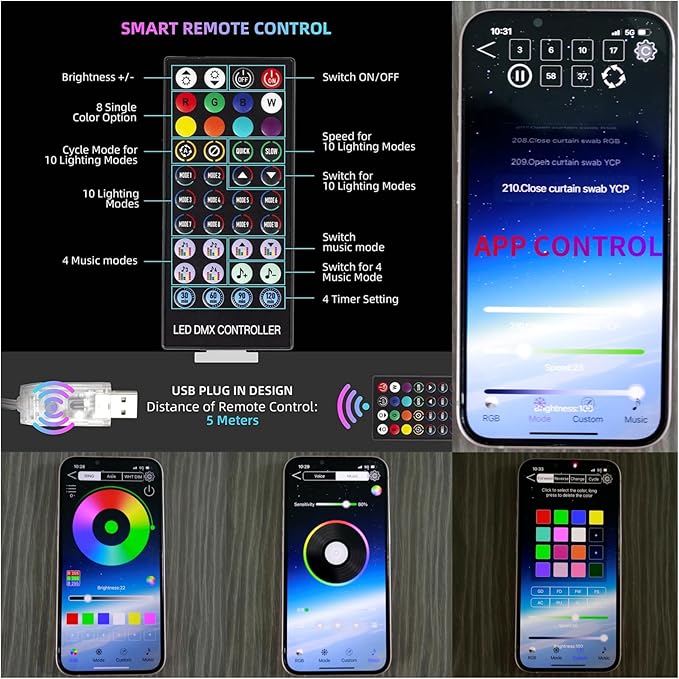 - [Remote and Smart App Control Christmas Tree Light]: App Control: 210 modes,Need to turn on bluetooth first,Setting RGB sorting,timing,shake,and change color,4 interface: color,mode,custom,music interface(Voice Control and Music).Remote Control: adjust the brightness and speed and 4 timing,8 Single Color Lighting for your choosing,and 10 lighting modes(NOTE:The Remote Control Needs to be Close to the USB Port).Controller: 1 button,Long Press(5 Seconds): Off, Short Press: Open and mode switch.
