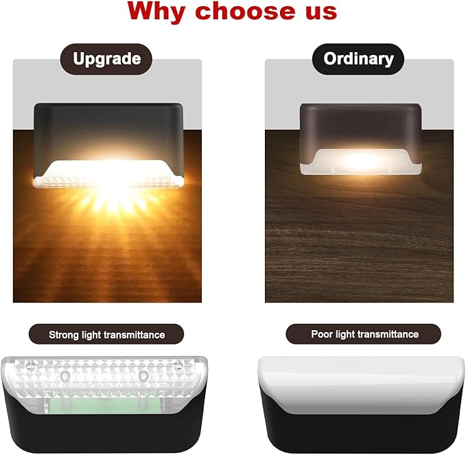 - Safer with Step Lights: Our solar lights emit just the right amount of light on which is safer for the whole family to go downstairs at night. These lights are widely used outdoors on fences, railings, stairs, pools, patios, porches, walls, paths, etc.