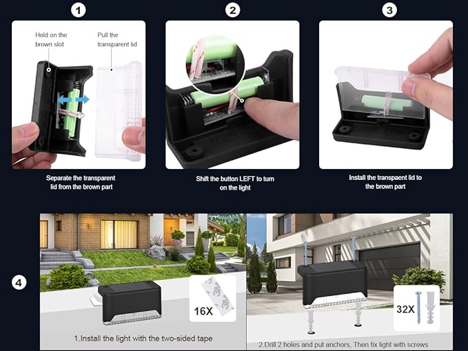 - 2 Ways to Install: They're super easy to mount on steps or railings, with screws or adhesive tapes that are both included. If you don't want to drill holes in the deck rail, secure the solar lights with adhesive tapes.
