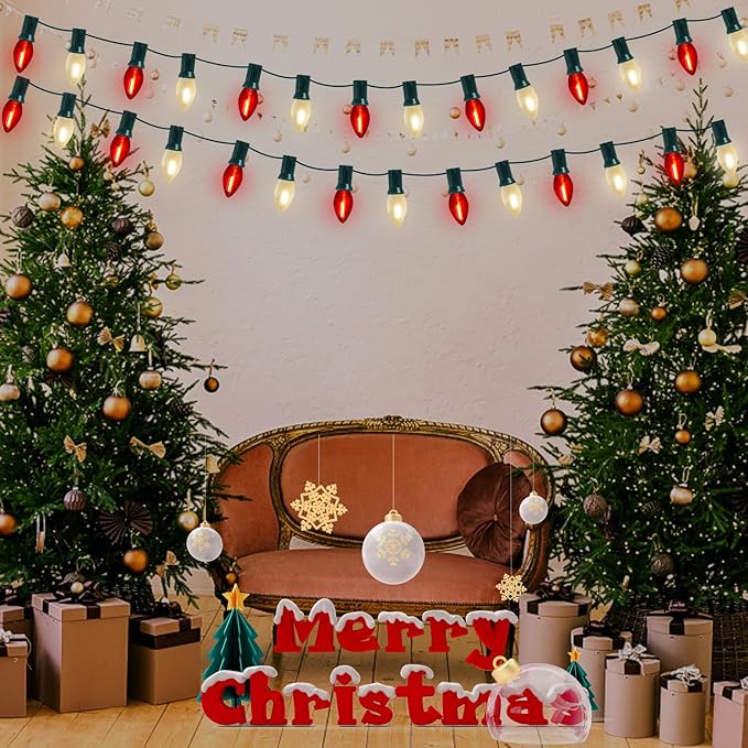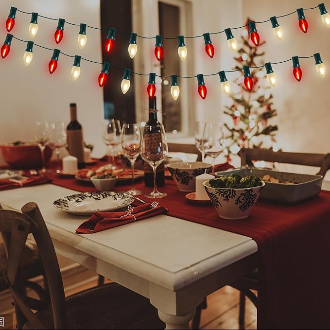 - 🌟 Versatile Application: Multicolor christmas decorations lights glow a warm white lights, retro Christmas light string is dimmable, lights dimming requires a dimmer. c7 led christmas lights can be used both indoor and outdoor, such as the bedroom, bar, window, Christmas tree, party, wedding, window, holidays, festivals, shows, restaurants, hotels, shopping centers, patio, or porch, pathway, roofline decorations and lightings