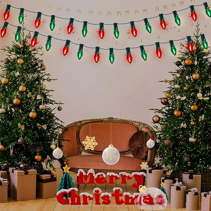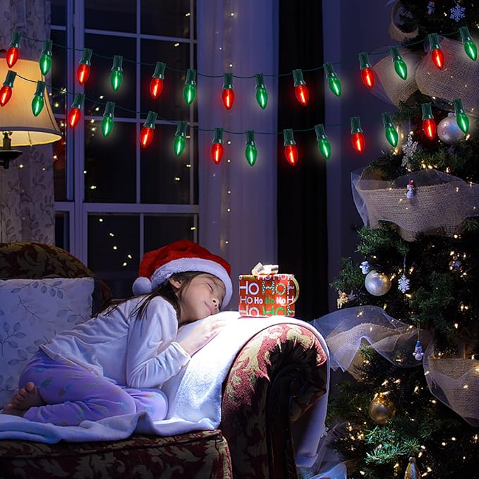 - 🌟 Versatile Application: Red green christmas decorations lights glow a warm white lights, retro Christmas light string is dimmable, lights dimming requires a dimmer. c7 led christmas lights can be used both indoor and outdoor, such as the bedroom, bar, window, Christmas tree, party, wedding, window, holidays, festivals, shows, restaurants, hotels, shopping centers, patio, or porch, pathway, roofline decorations and lightings