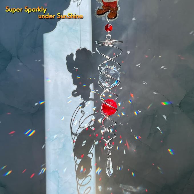 FONMY Santa Claus Gazing Ball Spiral Decorative Wind Spinner Sun Catcher Rainbow Maker Silver Spiral W/ K9 Crystal Ball Christmas Tree Hanging Ornament Indoor Outdoor Garden Decor. 22 in