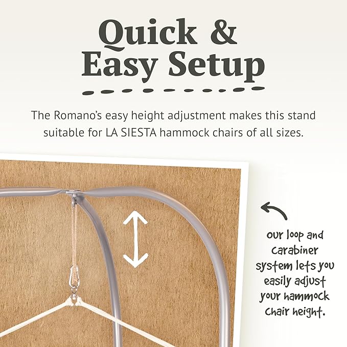 - STURDY & ADJUSTABLE SUPPORT: Experience added stability with our Romano stand designed to accommodate all hammock chair sizes and allowing for height adjustments. Crafted from durable powder-coated steel for indoor use, its large base and strategic vertical bars enhance stability without compromising freedom of movement.