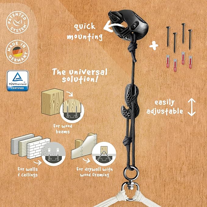- VERSATILE WALL SUSPENSION: Our hammock chair comes with a suspension kit, making it suitable for beams wider 3.5 inches, ceilings with wooden studs, and solid masonry. Easy to install with our patented MultiSpot’s four-screw mounting system to keep your hammock chair locked in place and our patented SmartHook for hassle-free height adjustment.