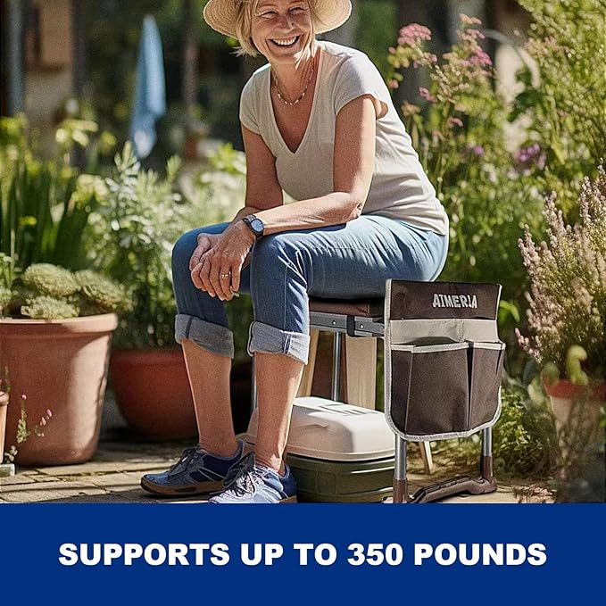 - Unbreakable, Foldable, and Ready-to-Go! Our garden kneeler is as sturdy as your grandma's oak tree swing, supporting up to 350 pounds with ease.. It's ready-to-use, no assembly required – just unfold, and voilà ! And, guess what? This kneeler is complete with a snap-lock that ensures it stays shut when it's flipped and used as a garden stool. Enjoy grab and go convenience with this garden kneeler that weighs just over 7 lbs. Aimerla Kneeler: making gardening chic and a breeze
