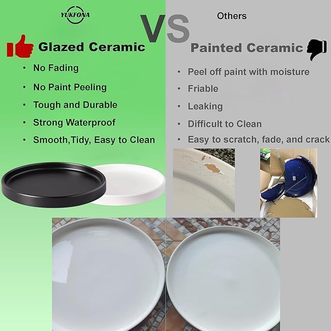 - Strong ceramic material : Our plant saucers pot tray are made of strong glazed ceramic to ensure durability and long life, diffent from plastic plant saucer, more textured and less prone to wear and tear. Choose your favorite potted plant tray color and design to perfectly match your pot and interior decor. Make your plants and home decor better than any other plastic plant saucers