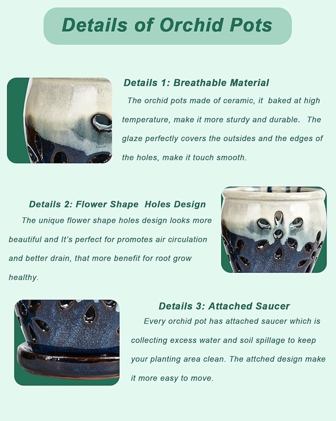 - 【 Perfect Air Flow and Drainage 】 The ceramic orchid pots side body have specially designed multiple holes for promotes air circulation and it has drainage hole in the bottom help for better drain and benefit for root grow healthy. Orchid pot with attached saucer could collect excess water keep your planting place cleaning.
