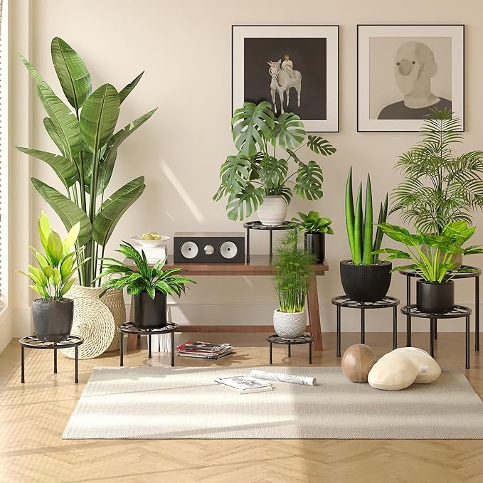 - Stylish Home Decor: Elevate your indoor or outdoor space such as home, balcony, garden, living room with our 5 pack metal plant stands. These small plant holder indoor showcases your plants beautifully while helping them soak in more sunlight.