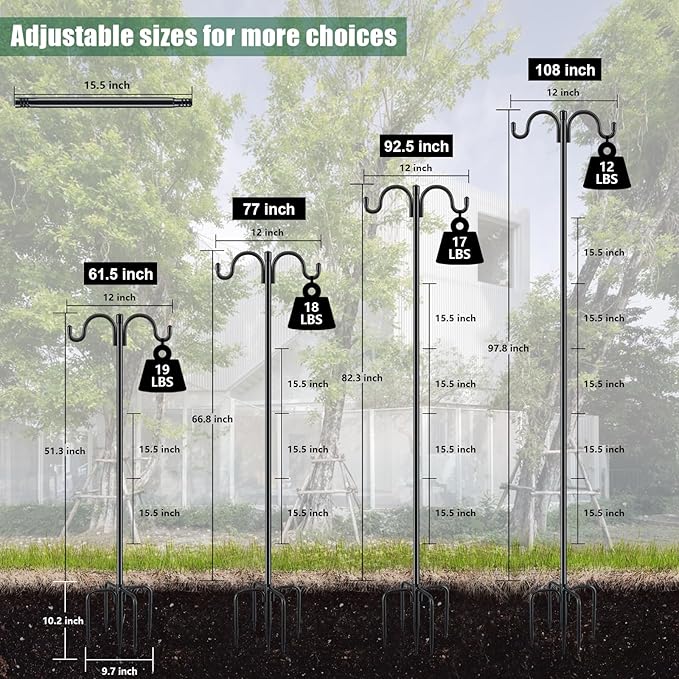 - 【SIZE INFORMATION】The height of the two sided shepherds hook is about 108 inch. Our plant hangers is made of high quality iron, the black coating on the surface is rust resistant. The height of the shepherds hook for bird feeder can be adjusted by adding or reducing the pole sections, each pole section is 15.5 inch. So you can adjust the height to 92.5 inch, 77inch, 61.5inch and 46 inch.