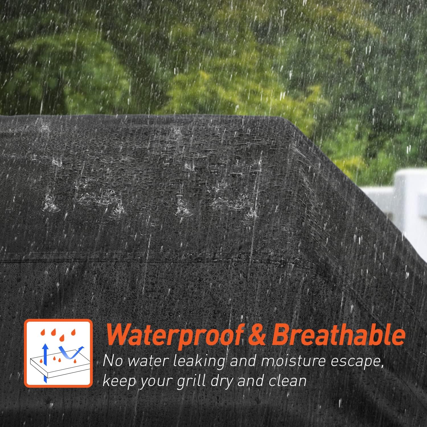 - 【Waterproof and Breathable Material】 - Made of waterproof and breathable 420D polyester fabric with PU backing, prevents water from seeping in and allows moisture to escape, keeping your outdoor grill dry and clean. The 55” grill cover is also easy to put on and take off, will not stick to your grill in hot weather.