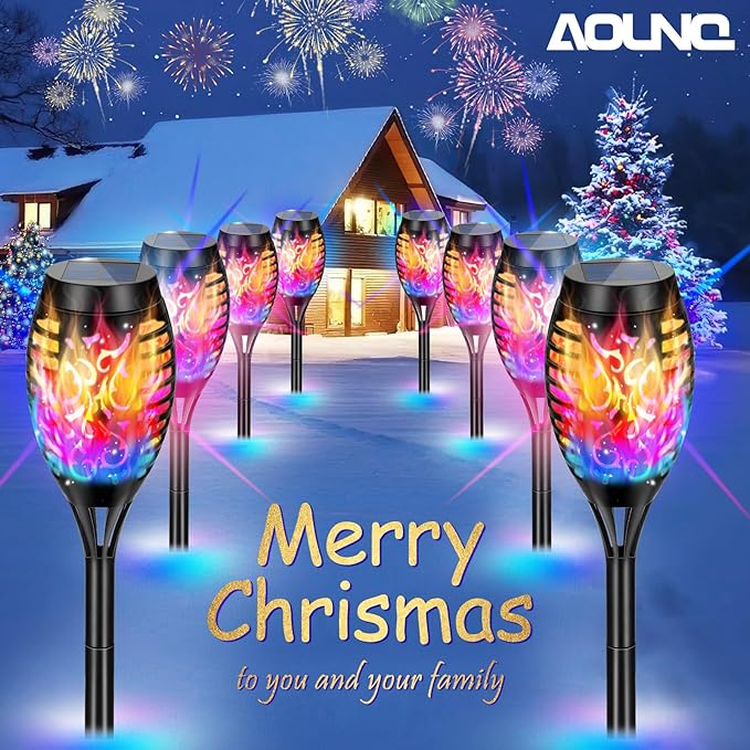- 🔥【Gorgeous Color Dance Fames】: Happy Christmas! Our solar Christmas light with multi -color flame is an excellent choice for outdoor Christmas decoration.The solar Christmas lights are designed according to the real flames. While flashing the gorgeous multi -color dance flames, it will emit safe soft and enhanced emotional light.This makes solar lights can effortlessly become the talk of the neighborhood, transforming your house magically into a Christmas wonderland.