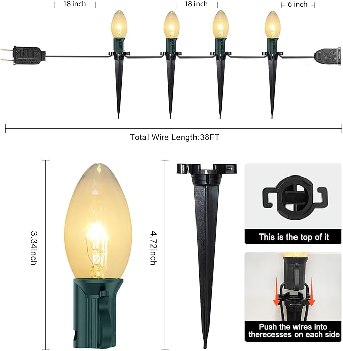 - OUTDOOR YARD PATH LIGHT: 38 feet C9 Christmas Path Lights have 27 clear incandescent bulbs (2 spare bulbs) and 25 stakes, each bulb 7W fits E17 base. The clear outdoor string lights emit a warm white glow, creating a warm and cozy Christmas atmosphere in your home.