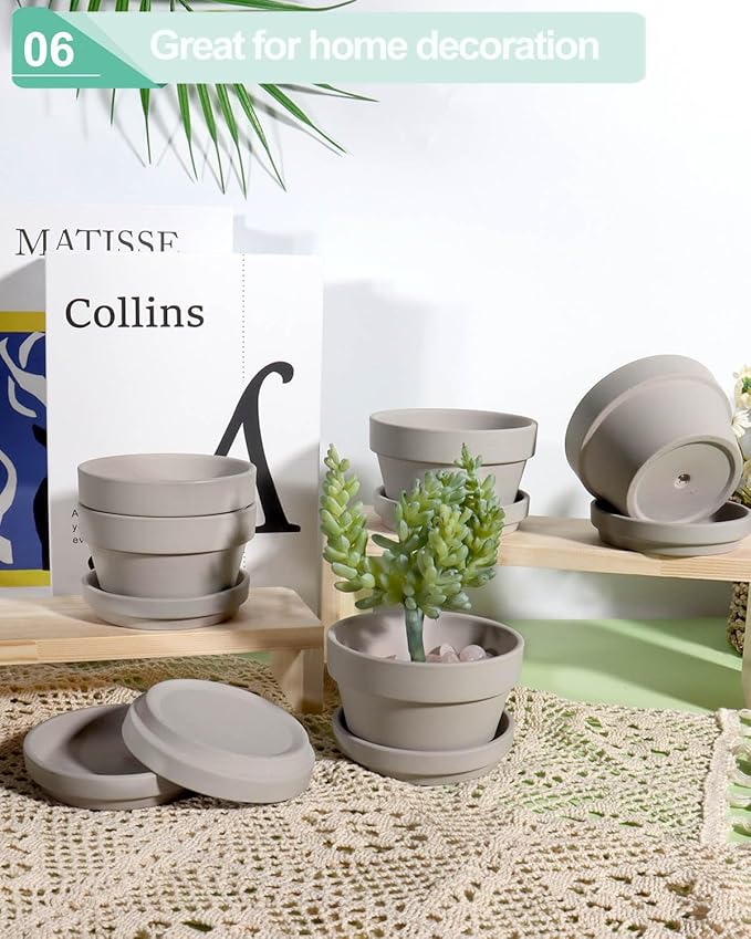 - Saucer&Drainage: Package included 6pcs terra cotta saucer to prevent dust and water from falling out of the drain, to keep the interior clean and to increase the beauty of the room the drainage outlet can prevent water accumulation and extend the life of the plant.