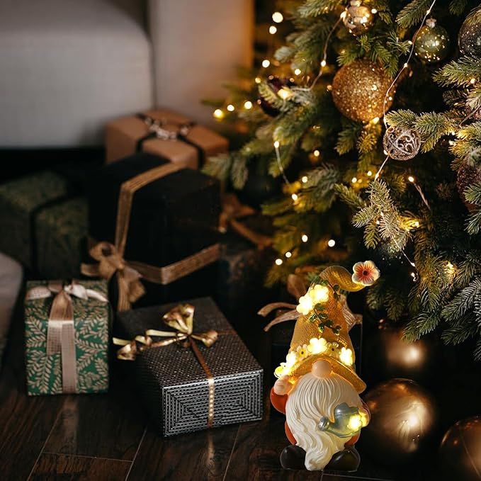 - 【Attractive Design for Gnome Statue】The garden outdoor gnomes in the hat stood with flower and bee in his hand, which Bees glitter when the night fell, looking quiet and pleasant. This lovely garden sculpture is ideal for outdoor patio decorations.Create a cozy atmosphere in your outdoor garden decor.The light will cast a soft and warm glow on the lovely statue.
