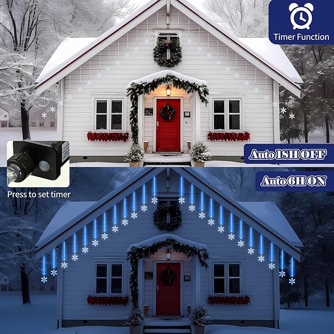 - Timer Function: falling rain Christmas lights come with a timer on the power source, which makes it easier for you to turn it on and off less frequently; Once timed activated, the lights will be 6 hours on and 18 hours off per day