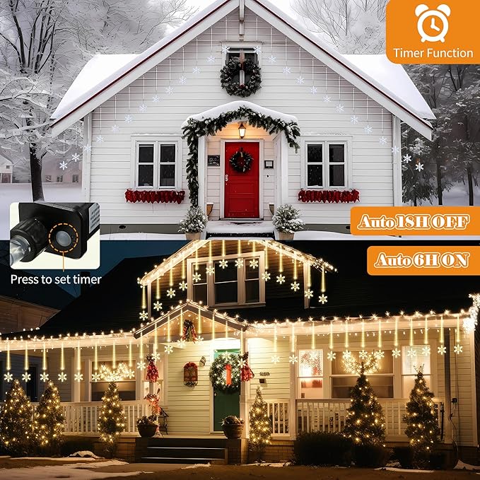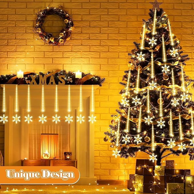 - Stunning Meteor Shower Snowflake Effect: create a mesmerizing atmosphere with our 480 LED Christmas meteor shower snowflake lights; With a good snowflake design, each of the LED lights will light up and down one by one in sequence and quickly, emitting warm white light, like realistic meteor showers or snow at night; The cascading snowfall effect will add a touch of magic to your Christmas decorations