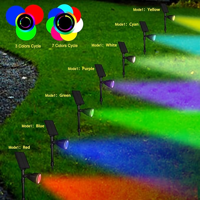 - VERSATILE CONTROL: Solar spot lights outdoor waterproof offers 9 dynamic modes, including 7 fixed colors and 2 engaging color cycle. Activate it with a long press, effortlessly toggle modes with a short press, providing unparalleled flexibility at your fingertips