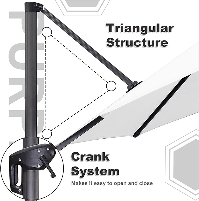 - The crank system of this cantilever umbrella makes it easy to raise and lower the canopy, the unique handle design also makes tilting the umbrella effortless, foot pedal allows for complete 360 degree rotation