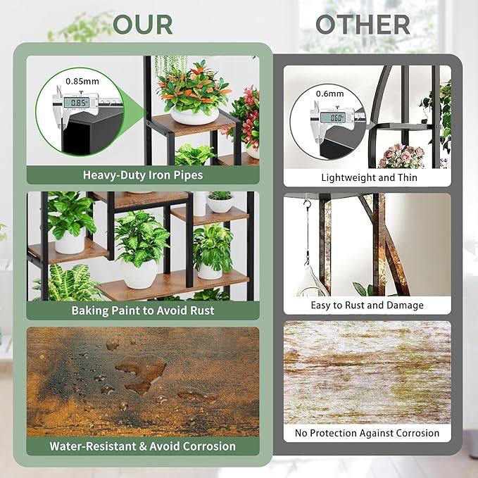 - 【Sturdy and Stable】 The frame of this metal plant stand is made of heavy-duty iron pipe that is 0.85mm thick, ensuring a robust structure and strong load-bearing capacity. The surface of the iron pipe is coated with special baking paint to avoid rust. Each layer consists of thickened particleboard offering resistance to cracking and coated with water-resistant layer to avoid corrosion, warping and curling caused by residual water.