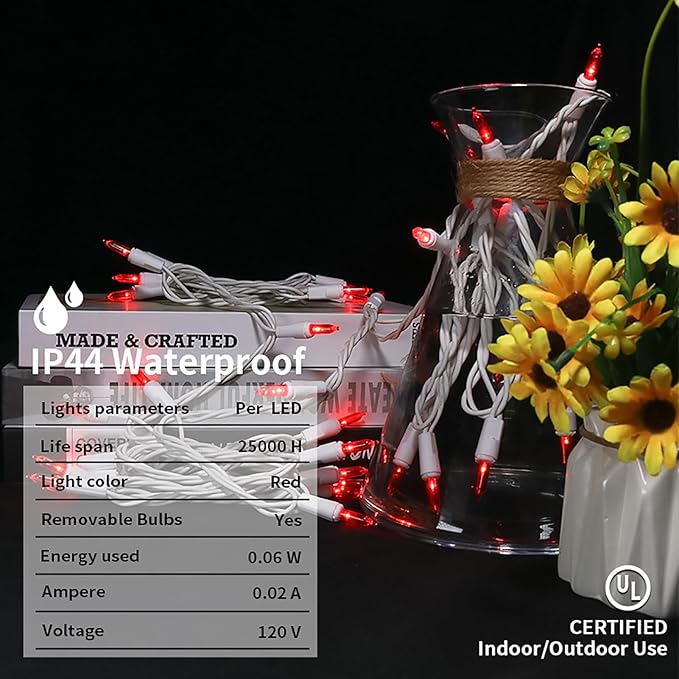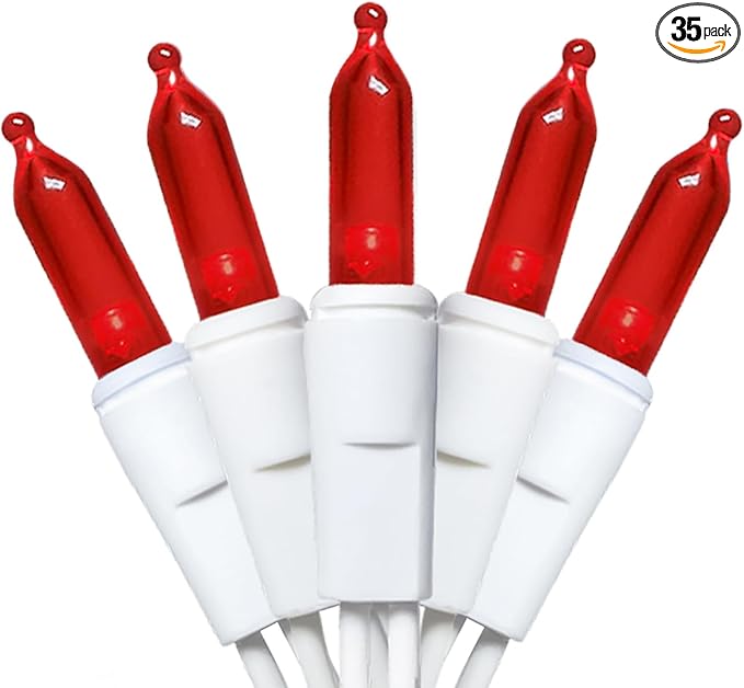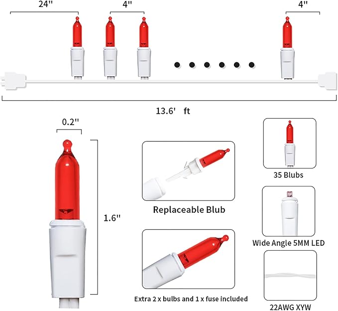 - 【Mini Christmas Lights Specification】: 1 Sets - white wire chritsmas light string includes 35 count red LED lights, total length 13.6ft, lights length 11ft and each led is 4 inches apart, 24 inches lead wire, 4 inches end connector (Extra 2 x bulbs and 1 x fuse included)