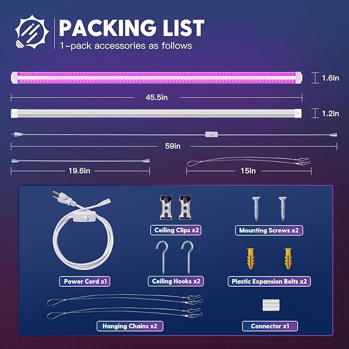 - Easy Installation: Two installation ways—Hanging or Mounting, with included wire rope hooks, clips, connectors, hooks and screws, you could install the grow lights for seed starting by yourself in minutes
