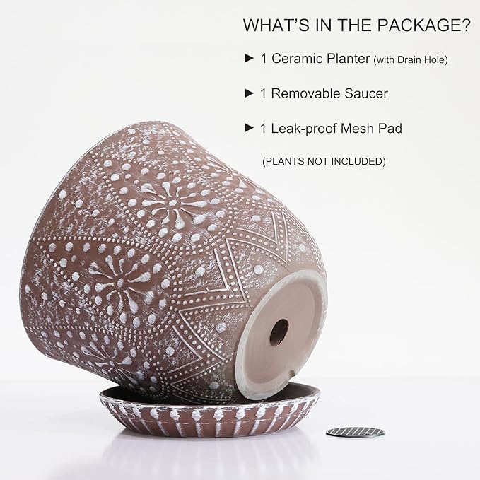 - Size & Package: 10 Inch Pot . Package: contains 1 ceramic flower pots, 1pcs mesh pads and 1pcs saucers(NOT INCLUDE PLANTS)