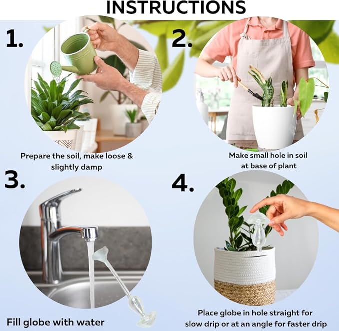 - Grow Healthy Plants : Evelots set of 4 self-watering globes are a perfect automatic irrigation system for your plants indoors and outdoors. Bulbs slowly drip the perfect amount of water needed into the soil to the roots and reduces water loss to evaporation