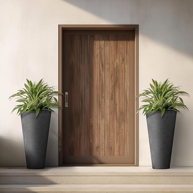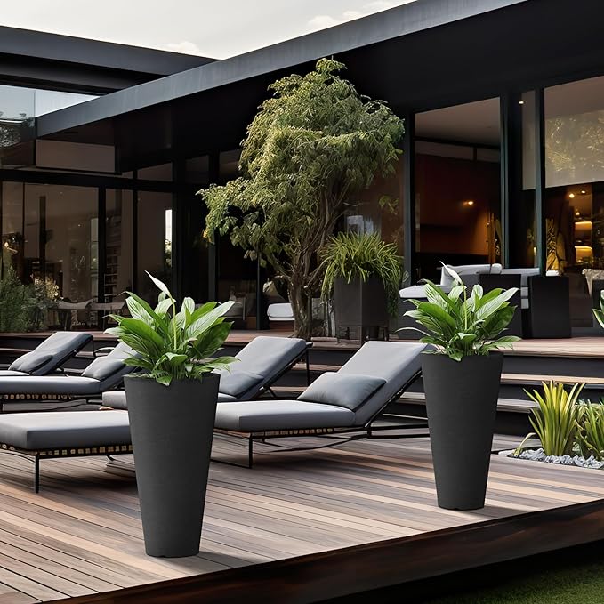 - Minimalist Chic - Elevate your space with these tall and wide planters, embodying sleek lines and a contemporary black finish—a defining trend in modern landscape design. The textured surface introduces an artistic touch to your garden, patio, office, living room, or front door area.