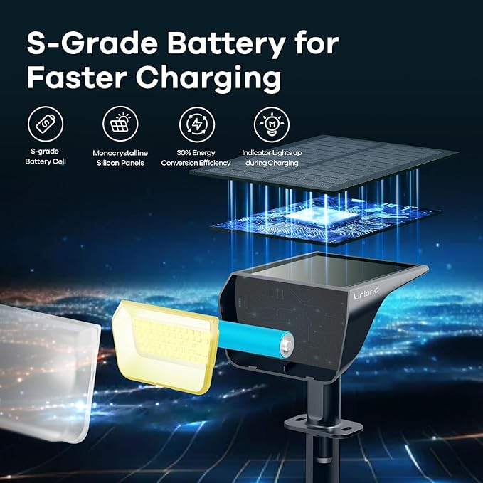 - Long-Lasting Battery & Efficient Solar Charging: A 1,500mAh lithium polymer battery charges via solar power, automatically lighting up at night. Outdoor solar lights with up to 30% energy conversion efficiency, reduce electricity costs. Charge for 48 hours before first use for optimal performance