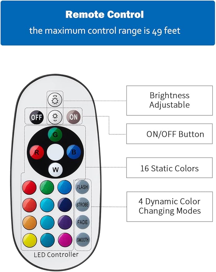 - RGBW Spot Lights Outdoor with Remote Control: These RGBW spot lights outdoor come in 16 static colors include warm white, 4 dynamic color changing modes (flash, strobe, fade, smooth), and 3 brightness levels. You can easy to set it up to your favorite mode with RF remote control, and with the memory function, they can remeber the previous settings so you don’t need to repeat the settings every time you turn on the lights. These RGB lights are ideal for Halloween Christmas or other holidays, and the included warm white color are also good for daily use.