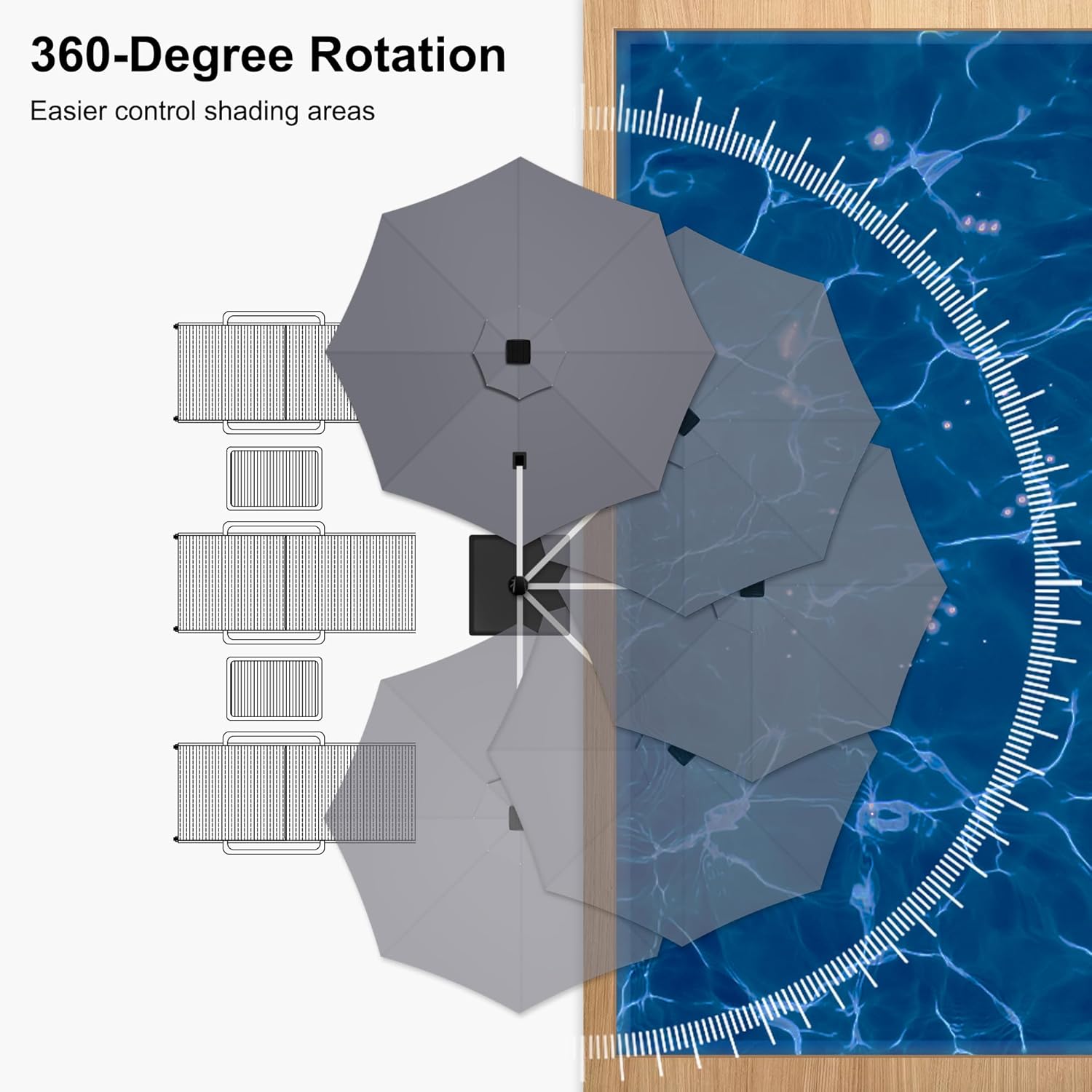 - The crank system and unique handle design allow for easy adjustment of the angle. The 360-degree rotation feature provides versatile sun protection