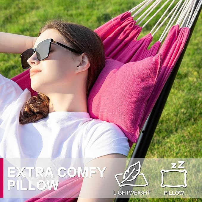 PNAEUT Double Hammocks with Stand for Outside, Portable Space Saving Heavy-Duty Steel Stand for Indoor Outdoor Patio with Carrying Bag, 450 lbs Capacity (Rose Pink)