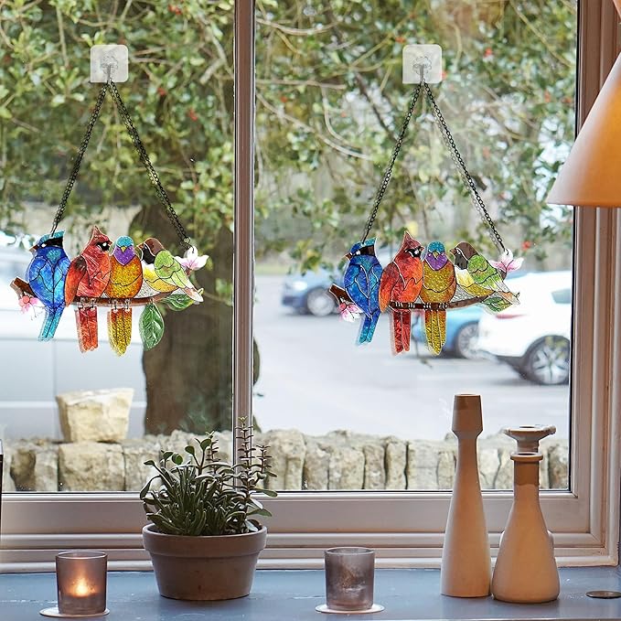 - Bird Lover Gift:This sun catcher a beautiful gift to bird lovers. This stained glass birds on branch not only makes a perfect memorial/grief gift, but also is a touching gift for other holidays.The stained glass suncatcher will be an awesome hanging decoration for a whole year.