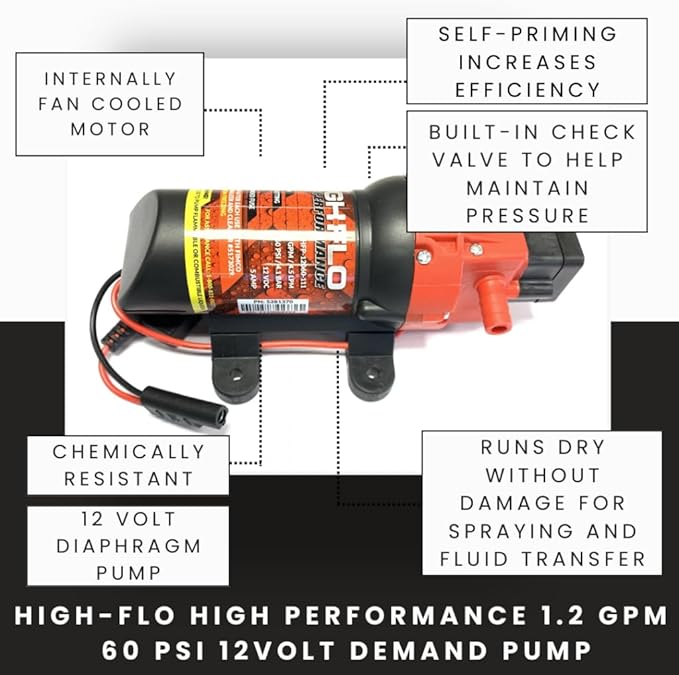- DEPENDABLE PUMP OUTPUT: High-Flo 12V pump delivers 1.2 GPM at up to 60 PSI, offering smooth, steady performance for consistent application in any terrain