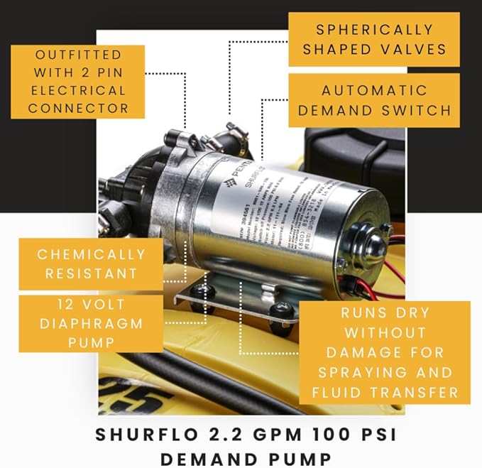 - PUMP BUILT TOUGH: Equipped with a SHFLO 12V diaphragm pump rated at 2.2 GPM and up to 100 PSI, offering strong and reliable pressure for effective spraying across various terrain