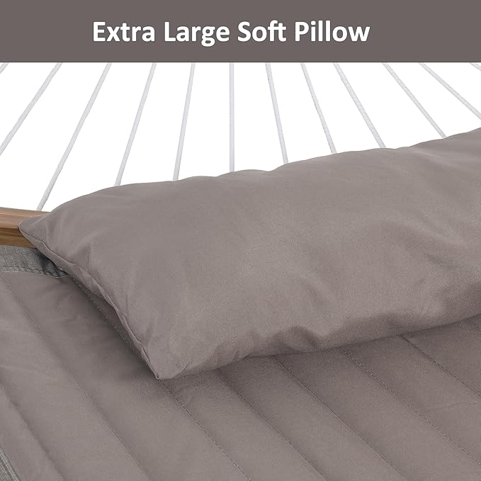 - Comfortable and Non-fading: Two-layer 100% quilted polyester fabric with poly fiber filling, cozier and best for camping and the outdoors. Compared with other quilted hammocks, it will not fade after long-term use. A polyethylene-stuffed head pillow offers superior comfort. You can even set your preferred height by hooking the suitable chain section to the hooks on the stand