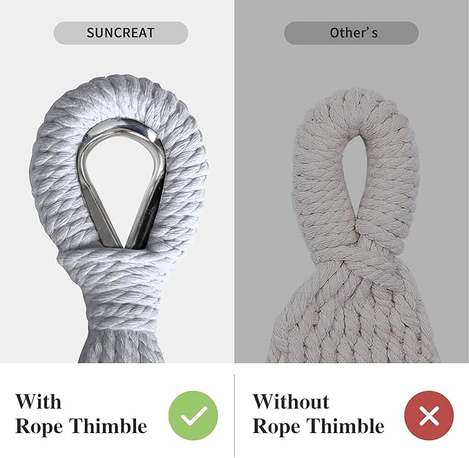 - Handcrafted Ropes: The metal rope thimble is effective for preventing the long-term friction between the tree strap and the ropes, thus prolong the service life of the hammock. The 18 ropes at both ends of the hammock are made of poly-cotton, tightly braided and fixed, which greatly increase the load bearing capacity