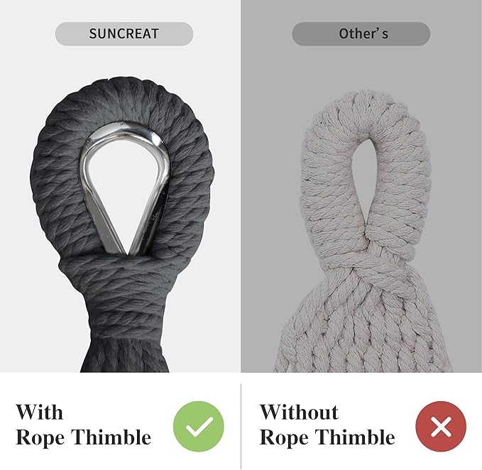 - Handcrafted Ropes: The metal rope thimble is effective for preventing the long-term friction between the tree strap and the ropes, thus prolong the service life of the hammock. The 18 ropes at both ends of the hammock are made of poly-cotton, tightly braided and fixed, which greatly increase the load bearing capacity