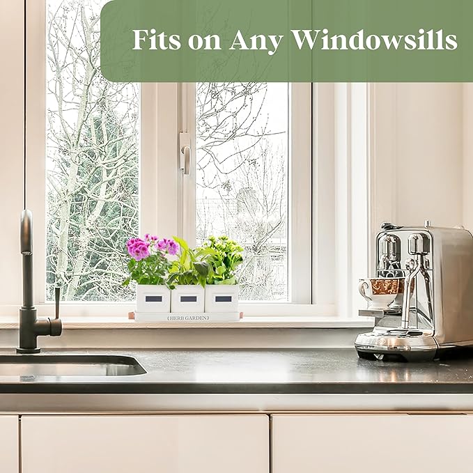- 【Windowsill Herb Garden】Our window herb garden includes three pots and a tray with a handle, with each pot measuring 4.4" W x 4.7" H, and the tray measuring 14.2" L x 4.9" W x 1.2" H. It's ideal for growing a variety of herbs such as mint, rosemary, basil, thyme, etc. Tailored for herb growth, our indoor herb pots provide an optimal environment for nurturing your herbs. Their farmhouse design and compact size make them perfect for placement on a windowsill or kitchen countertop.