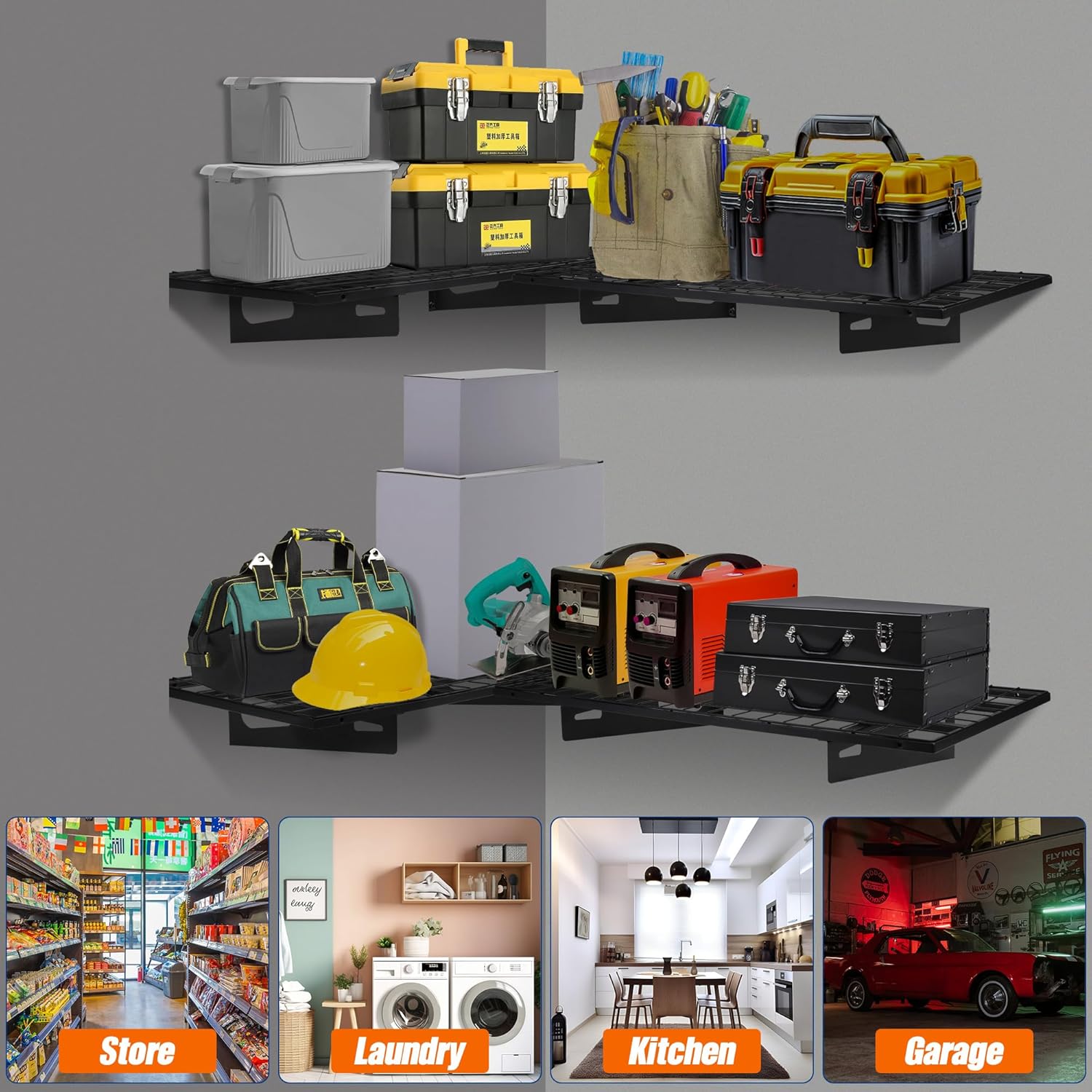 - Solid & Heavy-Duty Construction: Garage wall mount shelving is made of high quality steel with powder-coated finish. With a load capacity of 400 lbs total, they can handle almost everything from power tools to sports gear, providing versatile storage solution for any garage.