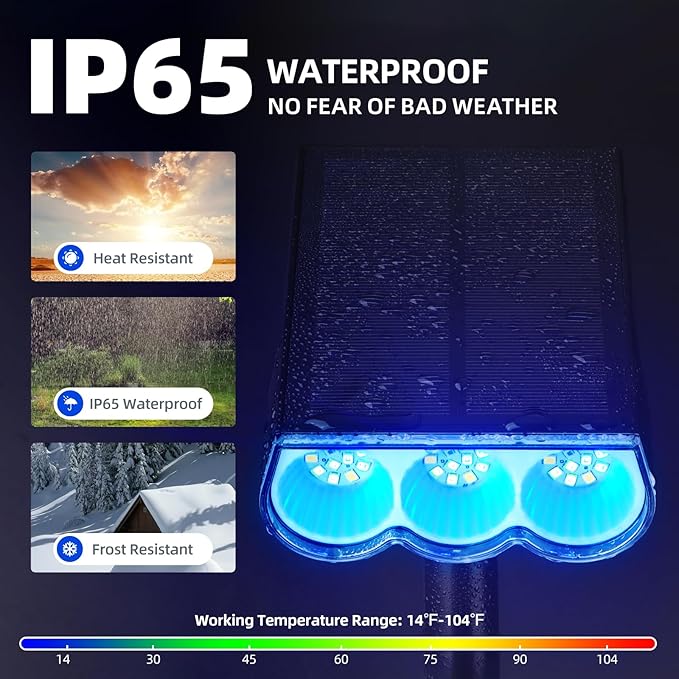 - Waterproof Solar Spotlights With Supreme Quality: his solar powered multicolored outdoor spotlight features a IP65 waterproof rating, powerful enough to withstand all kinds of terrible weather. It will charge in the day to store energy and auto-on at dusk and auto-off at dawn.
