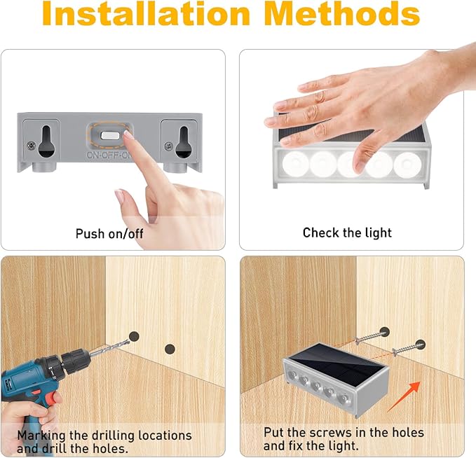 - 【Easy to Install】Solar Step light outside can be quickly installed in any outdoor step where it can absorb the sun light directly. Outdoor waterproof step light are widely used for step, stairs, deck steps, courtyard, balcony, guardrail, patioetc, also a fantastic option for festive decorative lighting occasions . You can fix solar lights with screws or expansion plugs, 2 screws and 2 expansion plugs is included in the package.